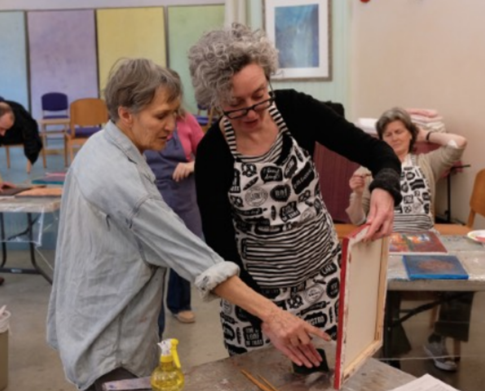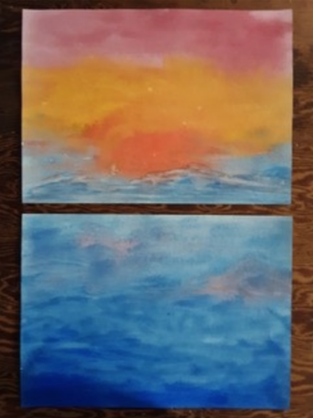 I was interested in the layers. She brought so many different experiences to us in the art classes. In the first term we worked with wet-on-wet watercolor and in the second term some black and white chalk and conte drawing and acrylic paints—these were the media. The classes were filled with a variety of experiences brought to us in the form of ‘invitations.’ In the very first class, Regine invited us to create a kind of landscape of where you are now and then to share that with another person. So, we looked at each other’s paintings. We had breathing space. We had the opportunity to talk about our next task, which was to make another painting that was growing out of one of the sides of the original painting—to choose one of the four directions. R: I wanted to give an opportunity to expand from what was. It’s interesting to see “this is the future; this is the past.” We were given the space, the time and the materials to contemplate, to explore and to do.